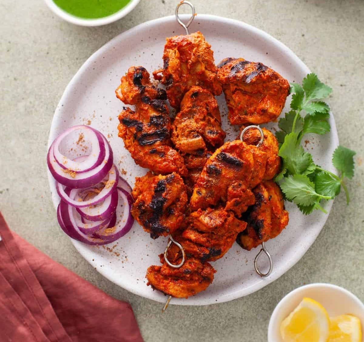 Boneless chicken pieces marinated in a blend of aromatic spices and yogurt, then grilled to perfection. The chicken is juicy and flavorful, with a slightly smoky char from the grilling process. Chicken Tikka (Boneless) serves a delicious balance of spices, making it a popular choice for appetizers or as a main dish.