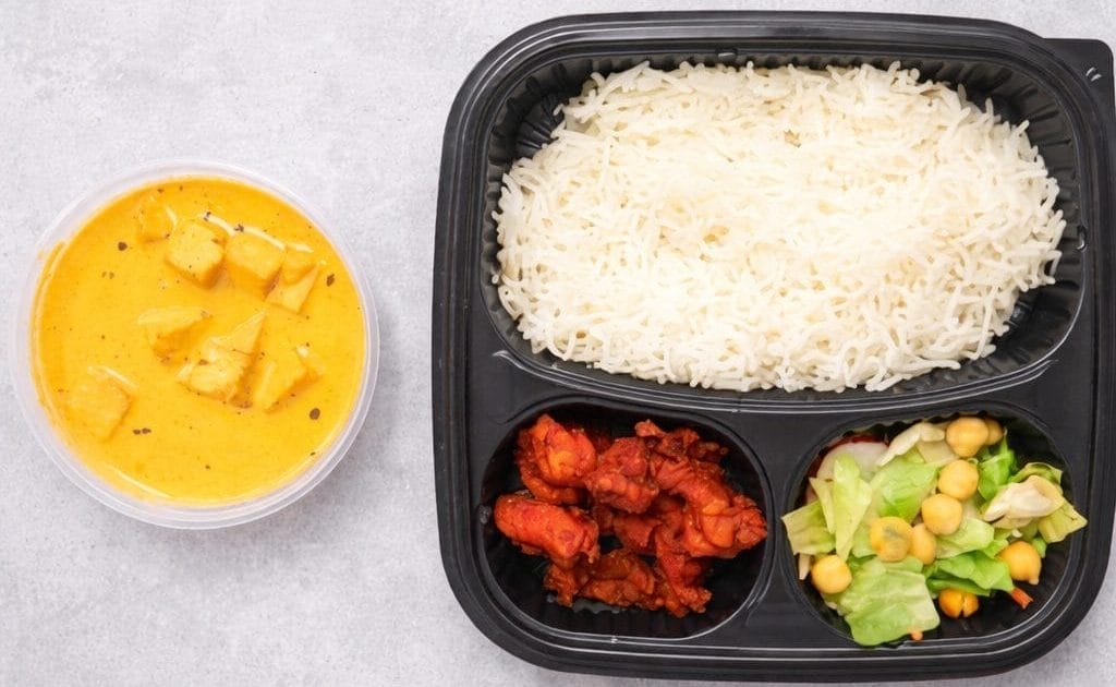 A hearty serving of a single, flavorful curry paired with basmati rice. The curry is cooked with a perfect mixture of spices, highlighting the natural flavors of the main ingredients. This dish serves a comforting and satisfying meal, perfect for those who appreciate rich, balanced flavors in every bite.